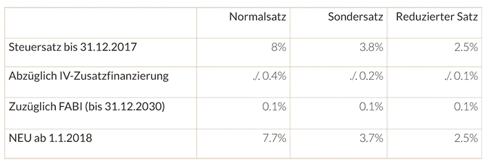 Der MWST-Satz beträgt heute 8%. Dieser berücksichtigt die am 31.12.2017 auslaufende zeitlich limitierte Erhöhung des MWST-Satzes um 0.4% für die Zusatzfinanzierung der IV. Neu per 1.1.2018 hinzukommend 0.1% für FABI (Bundesgesetz über die Finanzierung und den Ausbau der Eisenbahninfrastruktur) ergibt sich der Steuersatz von 7.7%