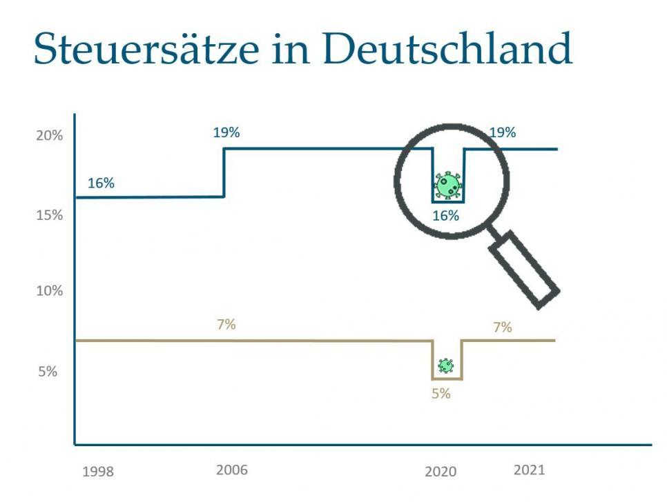 Die deutsche Bundesregierung hat beschlossen den Umsatzsteuersatz für nur sechs Monate von 19% auf 16% bzw. von 7% auf 5% zu senken.