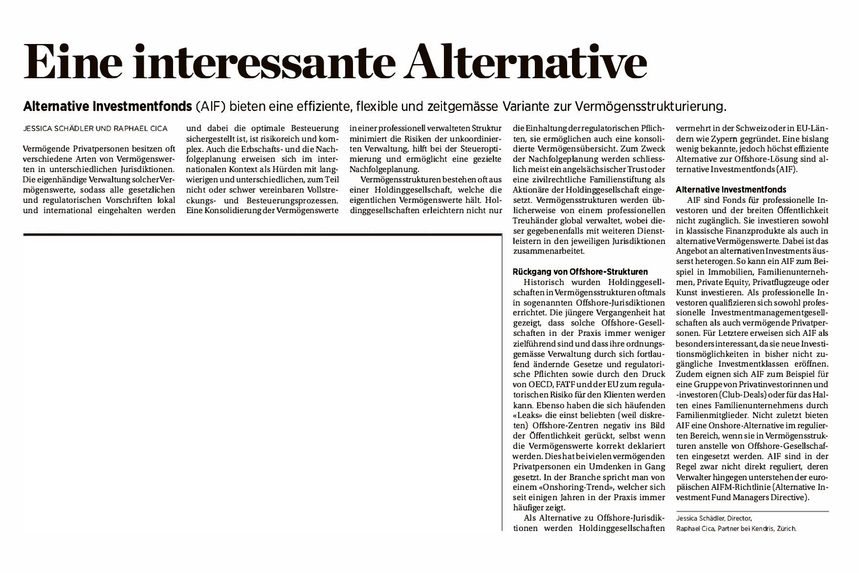 Als Alternative zu Offshore-Jurisdiktionen werden Holdinggesellschaften vermehrt in der Schweiz oder in EU-Ländern wie Zypern gegründet. Eine bislang wenig bekannte, jedoch höchst effiziente Alternative zur Offshore-Gesellschaft ist der "Alternative Investment Fund" (AIF).