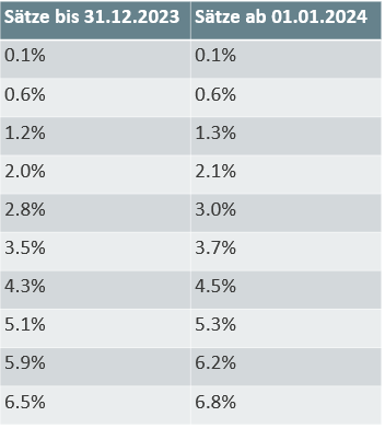 Im Wesentlichen sind Leistungen, die vor dem 1. Januar 2024 erbracht wurden, nach den bisherigen Steuersätzen zu versteuern, während Leistungen, die nach dem 31. Dezember 2023 erbracht werden, den neuen höheren Steuersätzen unterliegen.