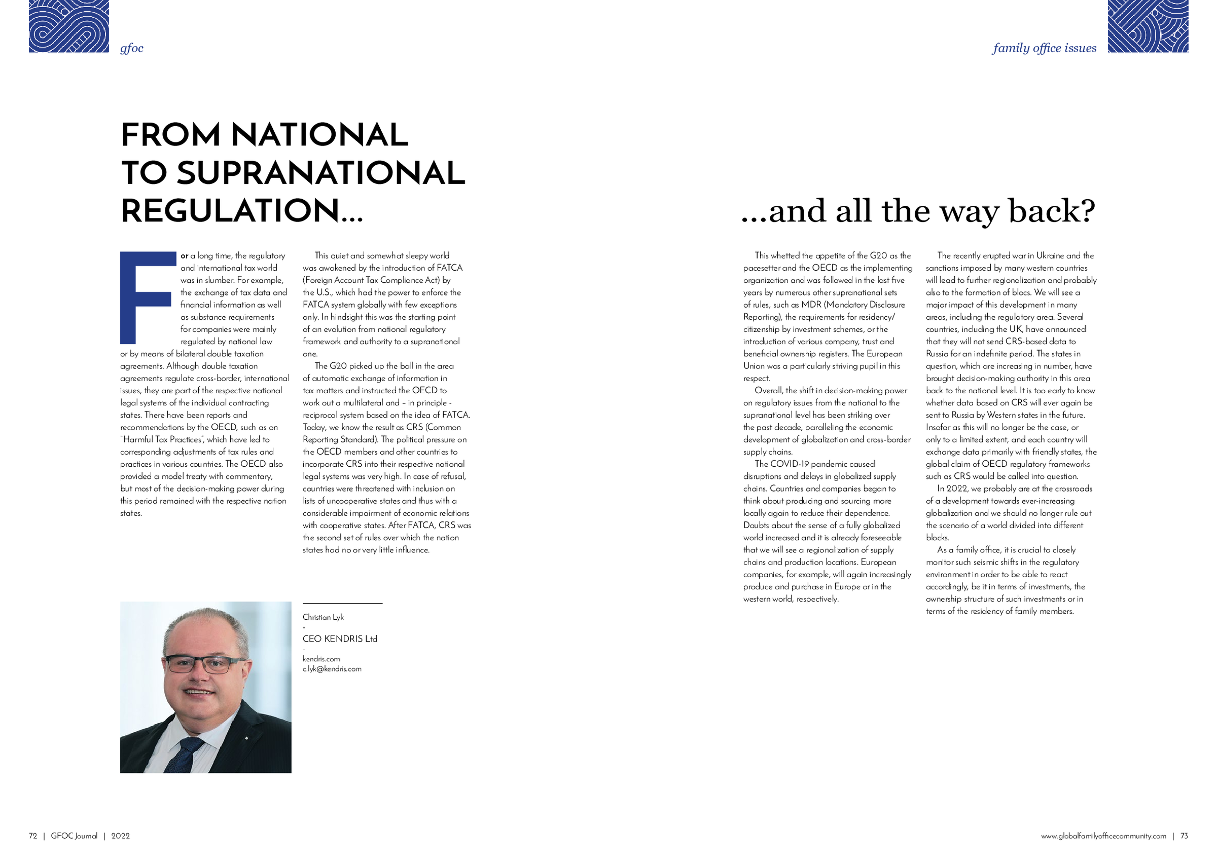 This quiet and somewhat sleepy world was awakened by the introduction of FATCA (Foreign Account Tax Compliance Act) by the U.S., which had the power to enforce the FATCA system globally with few exceptions only. In hindsight this was the starting point of an evolution from national regulatory framework and authority to a supranational one.