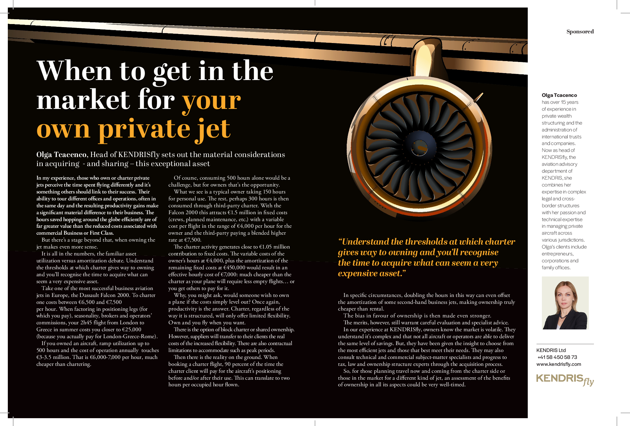 In our experience at KENDRISfly, owners know the market is volatile. They understand it’s complex and that not all aircraft or operators are able to deliver the same level of savings. But, they have been given the insight to choose from the most efficient jets and those that best meet their needs. They may also consult technical and commercial subject-matter specialists and progress to tax, law and ownership structure experts through the acquisition process.