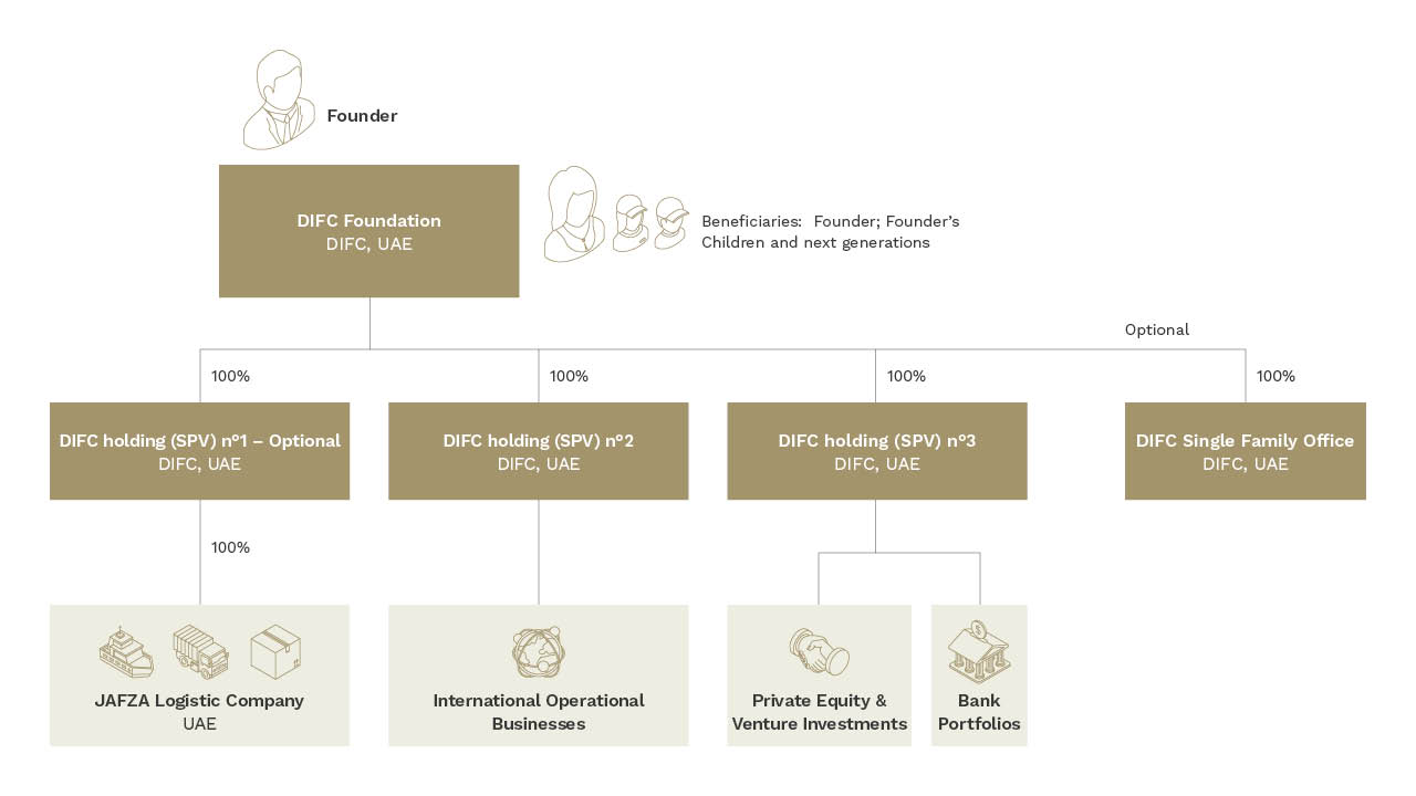A family-owned conglomerate continues to run its logistic operations from JAFZA, while establishing a DIFC Foundation and holding structure to ensure governance, succession, and asset protection. Through holding companies/SPVs, the family can segregate different asset classes, including financial portfolios, international operating businesses, and private equity or venture capital investments.